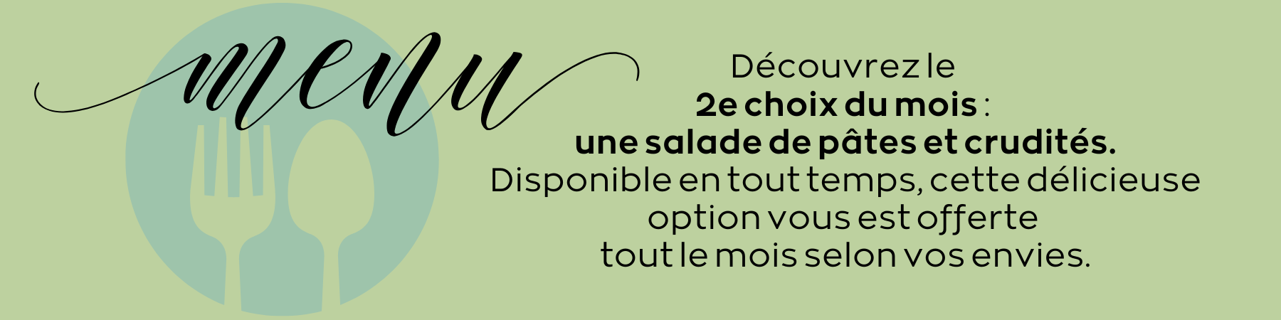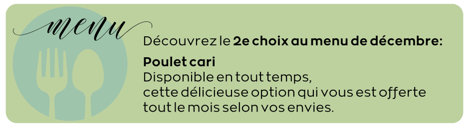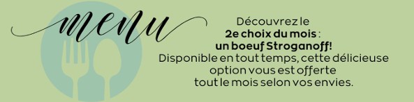 - REPAS CONGELÉ: pour 4 $ le plat, il est maintenant possible de commander des plats congelés qui ne se trouvent pas sur le menu du mois. Pour consulter la liste des plats congelés, cliquez sur un de ces liens: Plats congelés en français | Frozen meal english menu